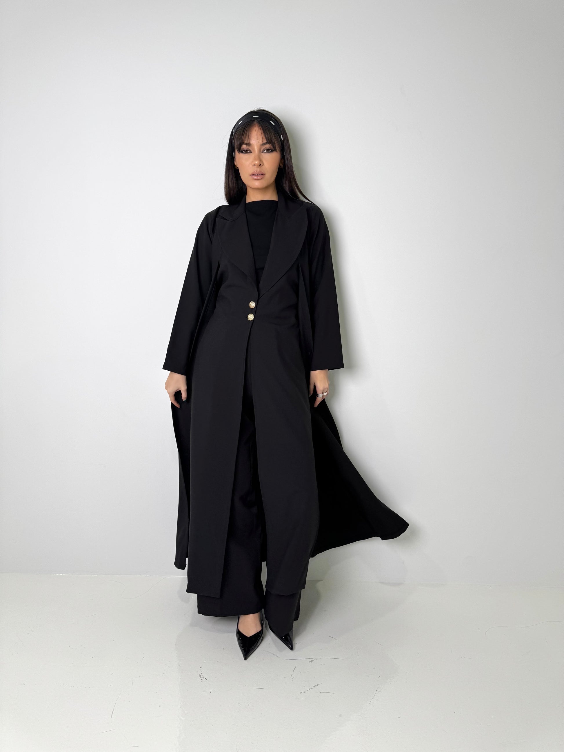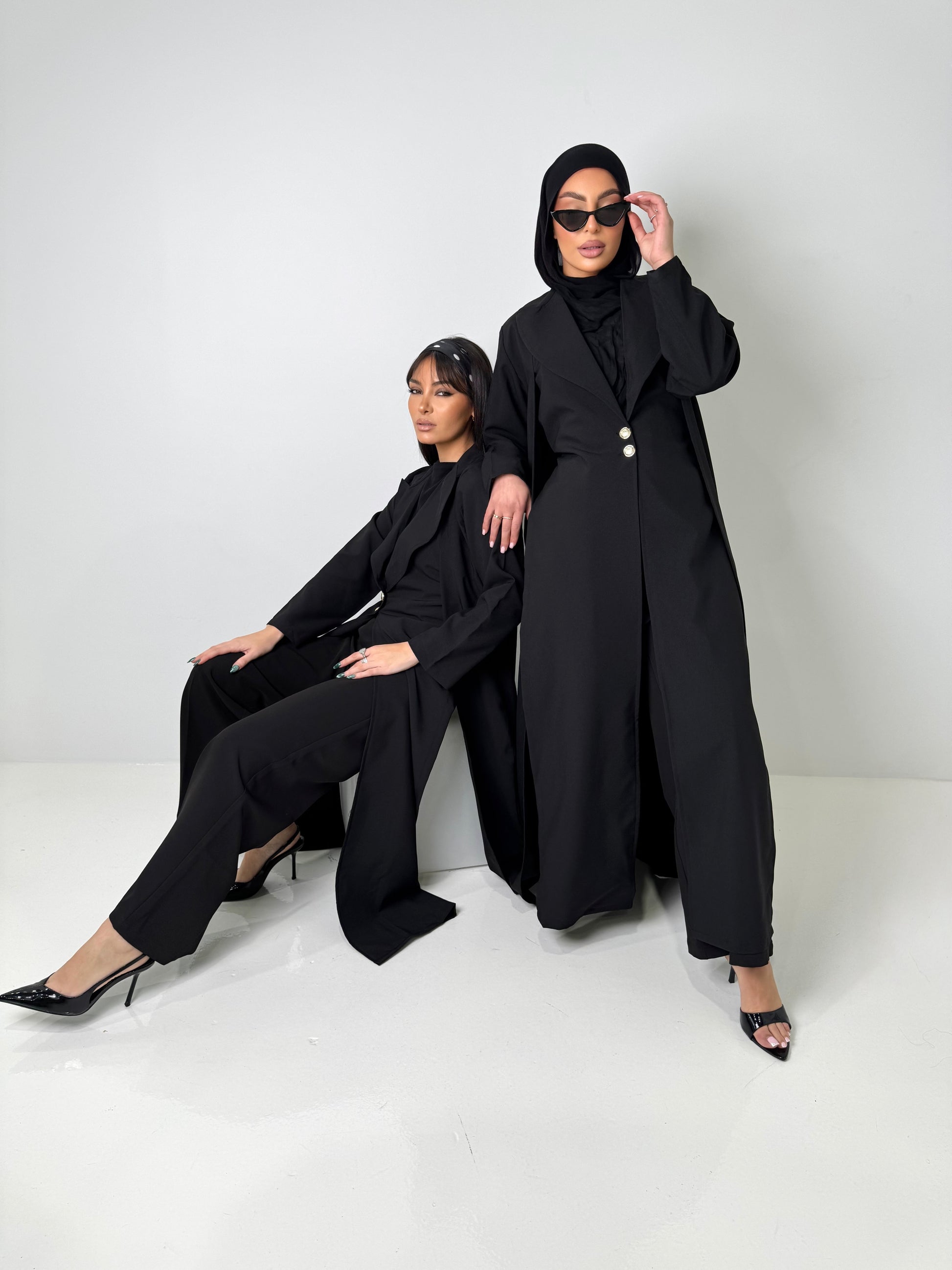 Introducing the Ebony Blazer Abaya, a modern twist on a classic style. With internal waist ties for adjustable comfort, front slits for ease of movement, and a sleek full length design, this black abaya is the perfect blend of style and function. Elevate your wardrobe with this must-have piece.