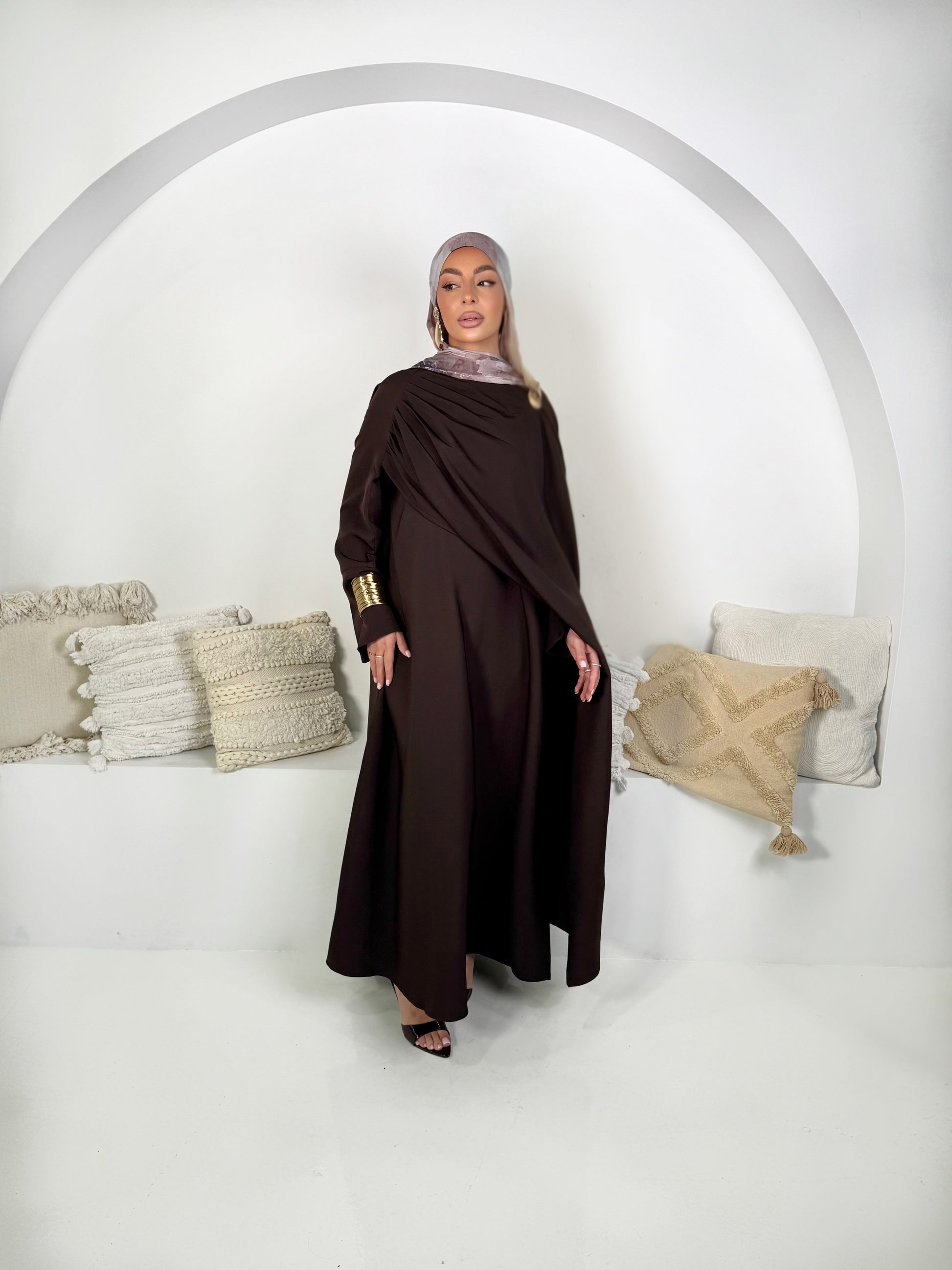 This Winter Closed Shawl Abaya is expertly crafted in the UAE using premium heavyweight barbie crepe. Its full length and modest fit are complemented by a long attached shawl and a gold brooch that make it the ultimate choice for the season.